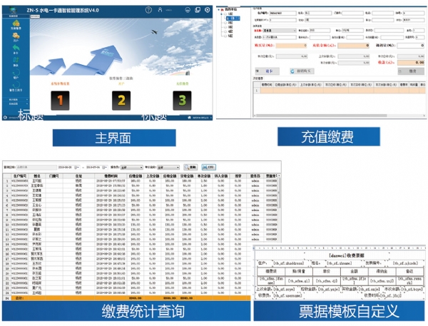 收費(fèi)管理軟件主要實(shí)現(xiàn)開戶、充值繳費(fèi)、補(bǔ)卡、換表、銷戶、繳費(fèi)記錄查詢、報(bào)表統(tǒng)計(jì)、票 據(jù)自定義等功能;
